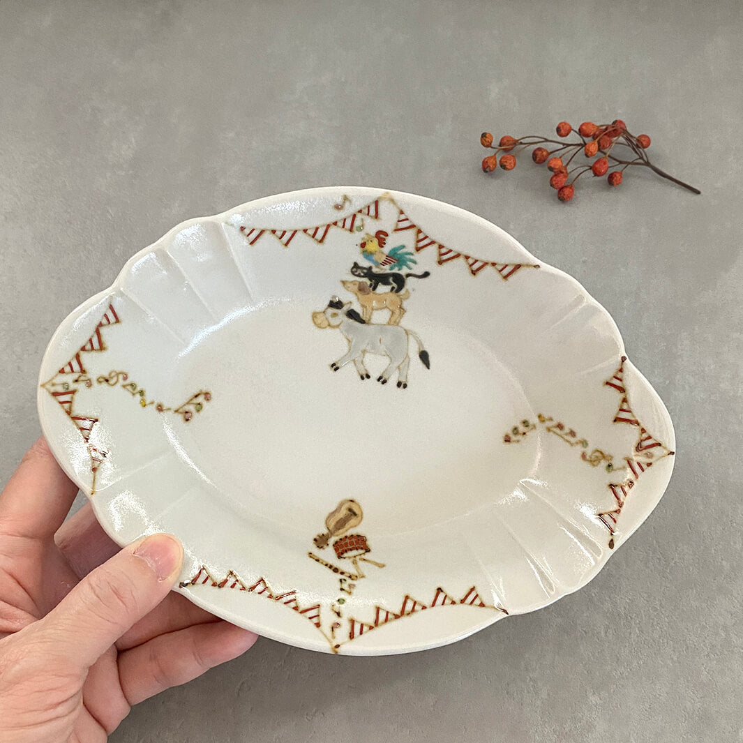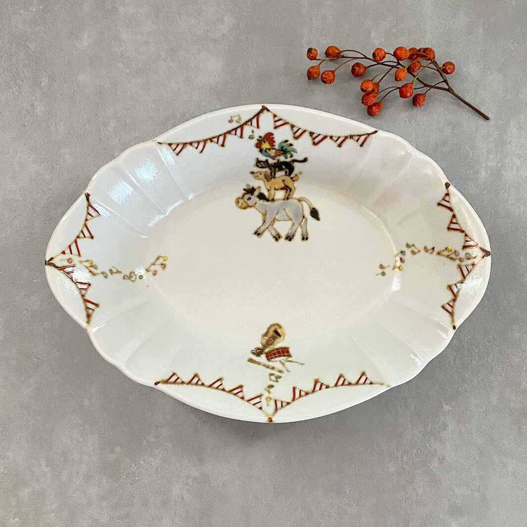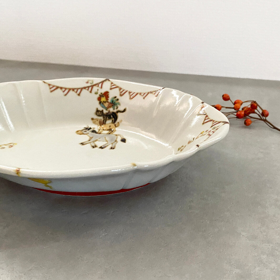美しい器の形状と、楽しげなガーランドと動物たち。色々なシーンで活躍してくれる、特別感のある器です。