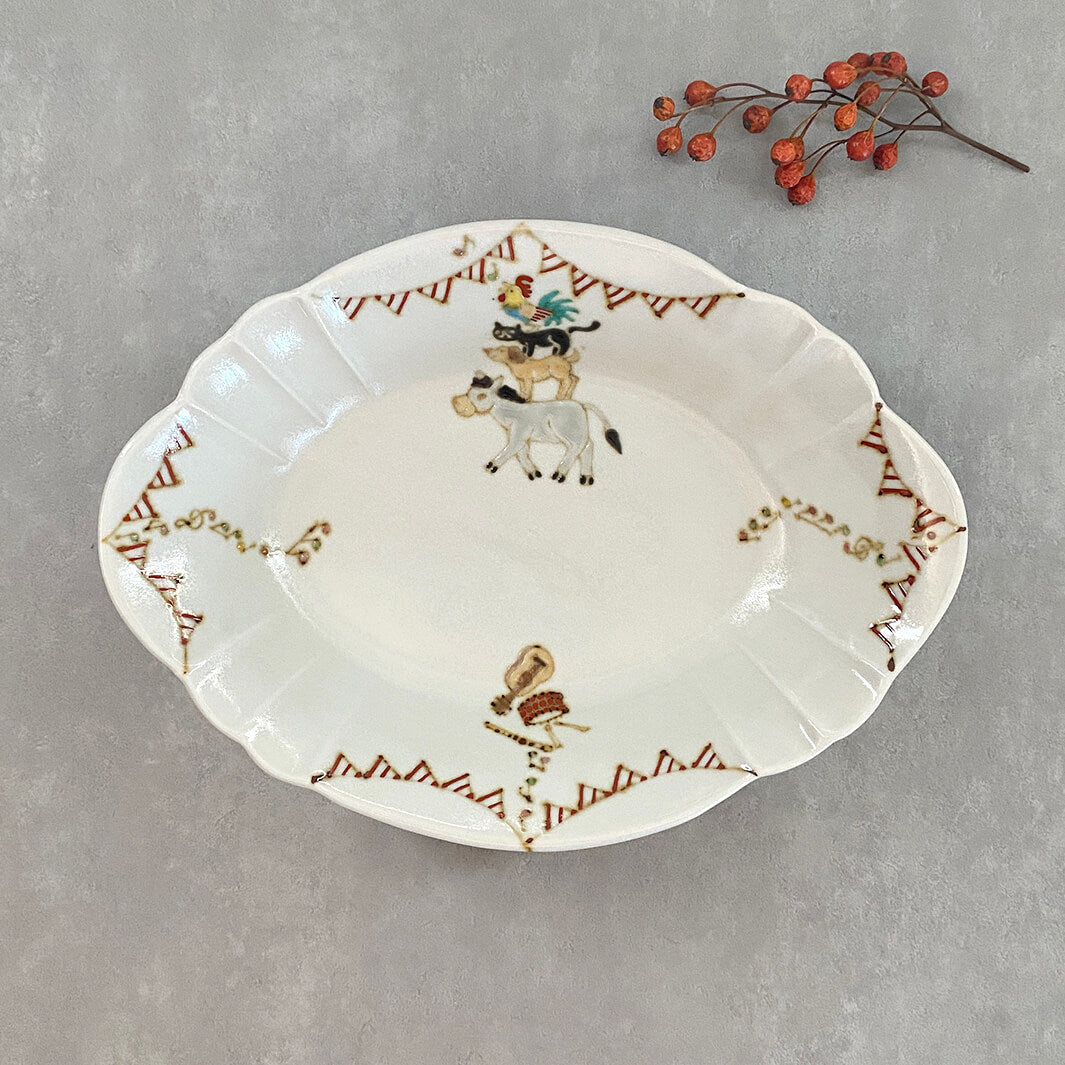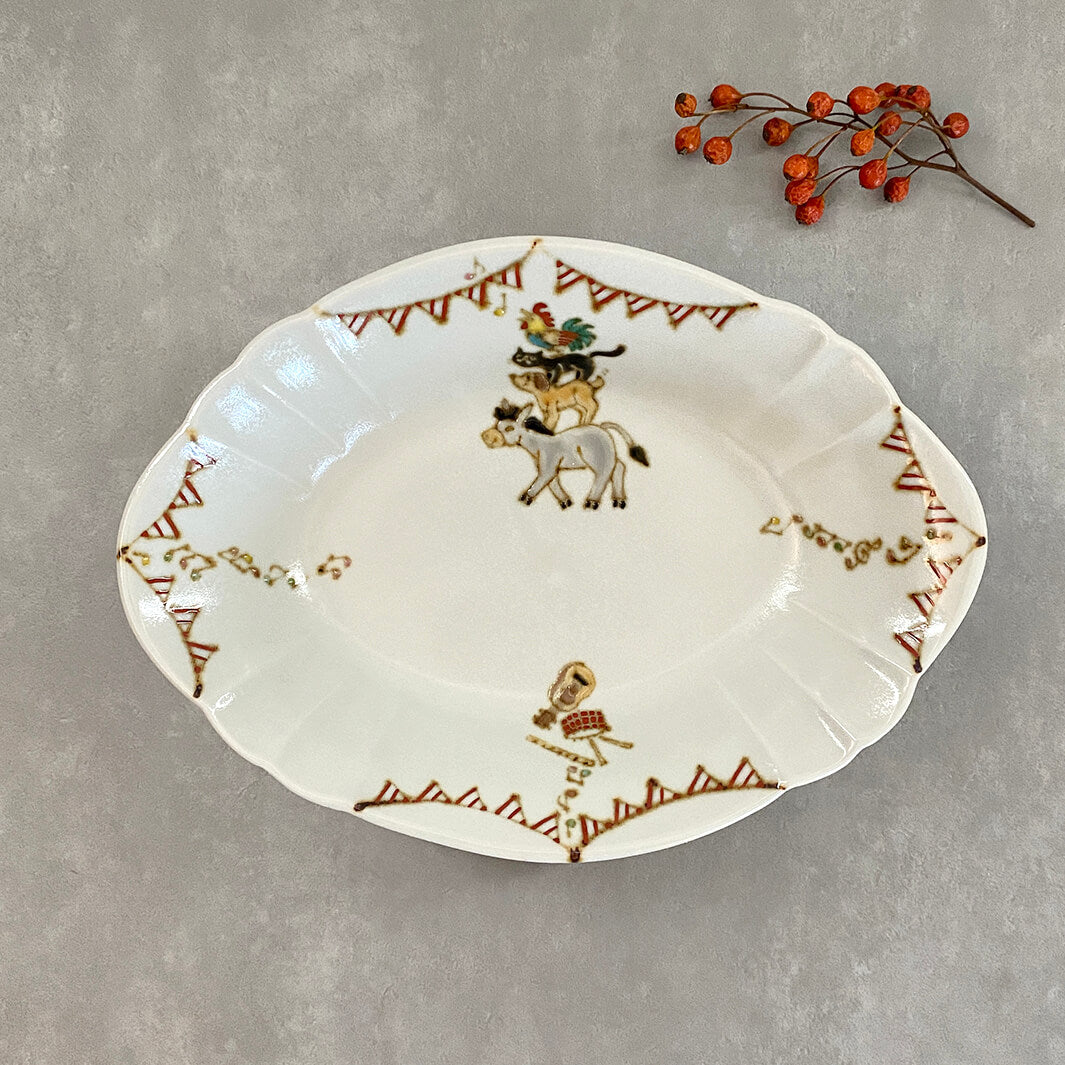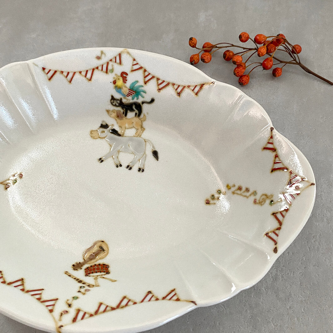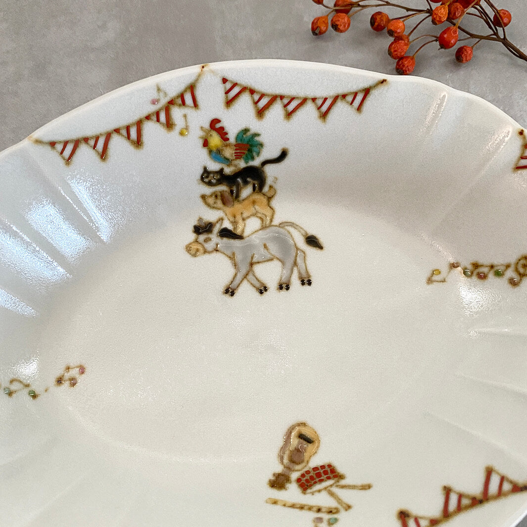 美しい器の形状と、楽しげなガーランドと動物たち。色々なシーンで活躍してくれる、特別感のある器です。