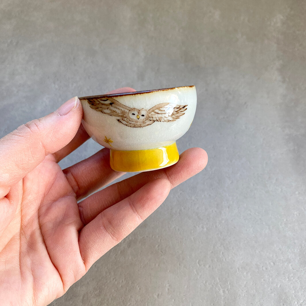 「フクロウ」と「月」を主のモチーフとして、可愛らしさの中にどこか神秘的な空気を纏った器たちを生み出しています。日常使いしやすいベーシックな形状に加え、色の組み合わせや展開にも細やかな工夫が込められています。