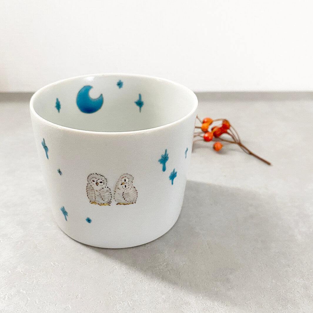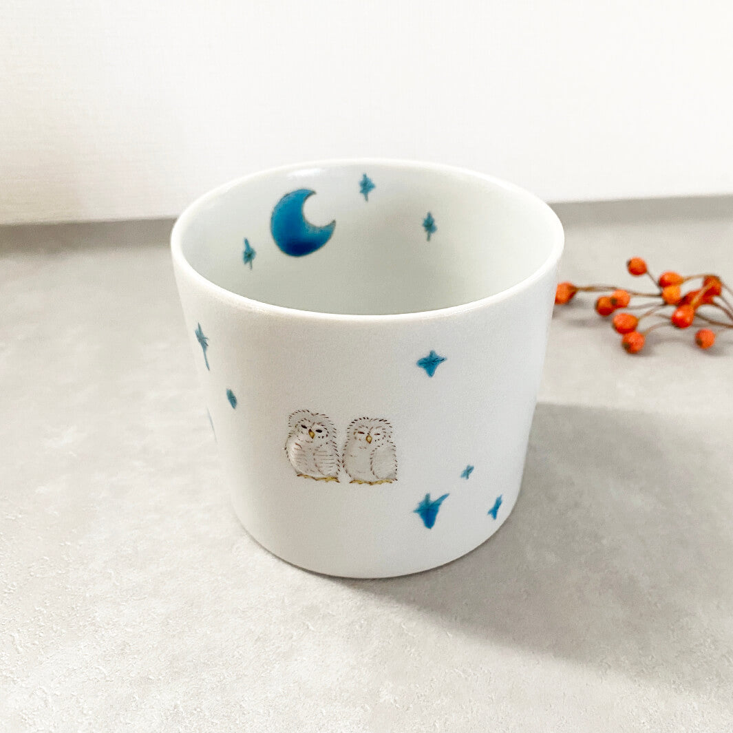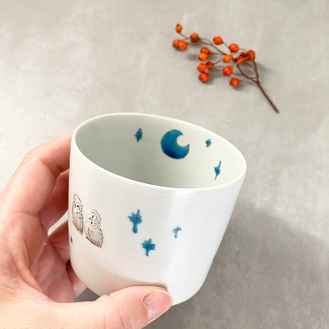 鳥の中でもフクロウが好きで、器にフクロウを描きたいと思いまずモチーフとして選びました。そして器を作っている時間が主に夜なのと、フクロウとも相性が良いことから月もモチーフとして選びました。