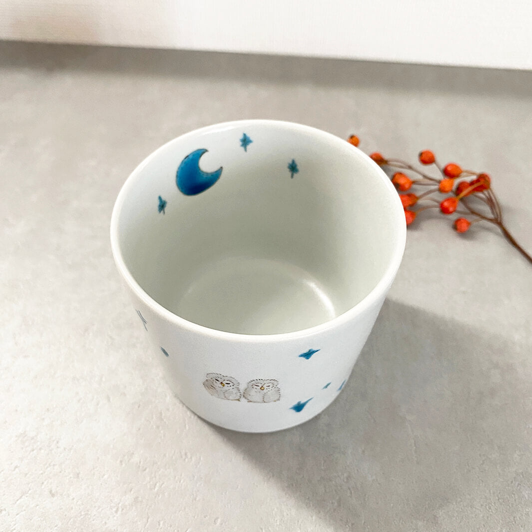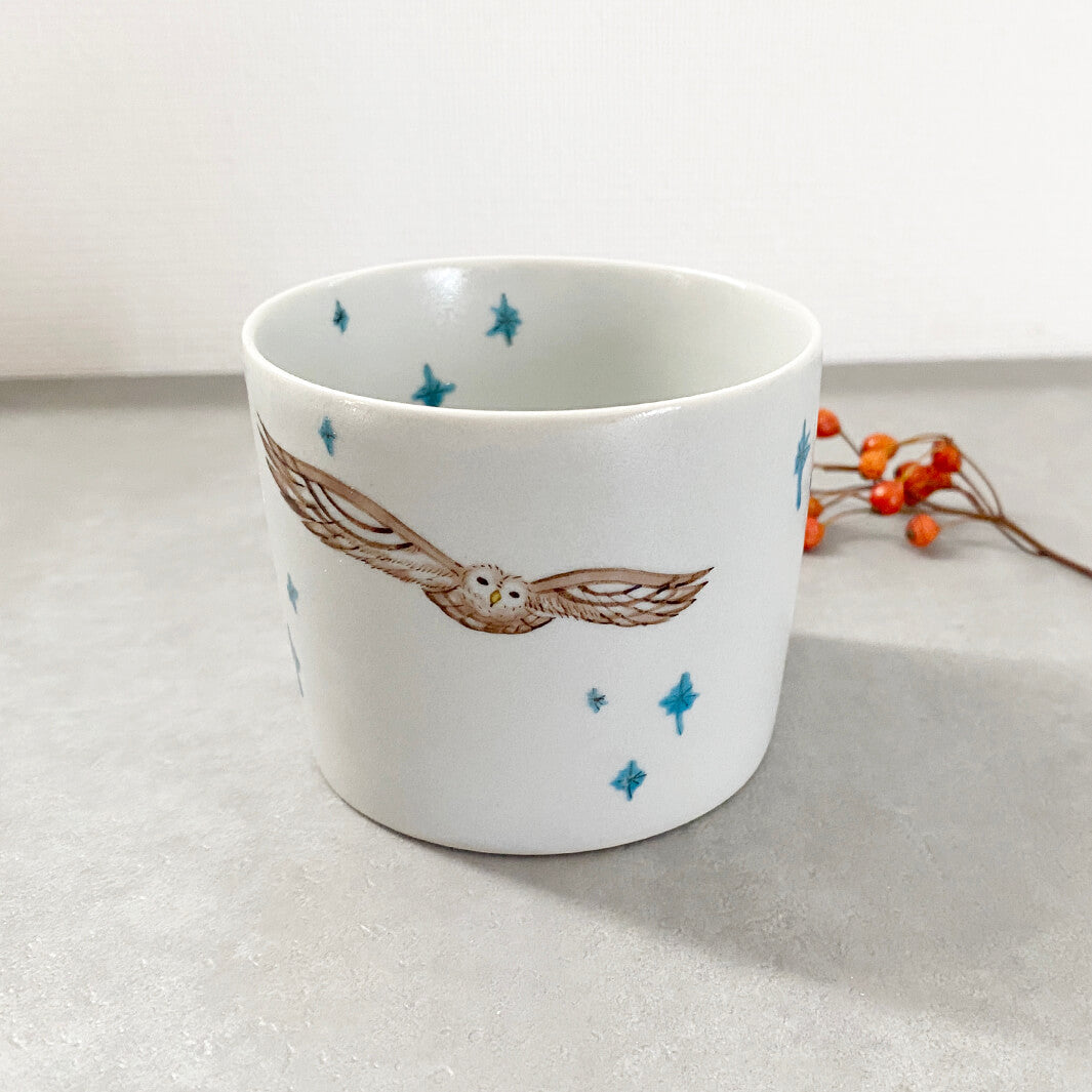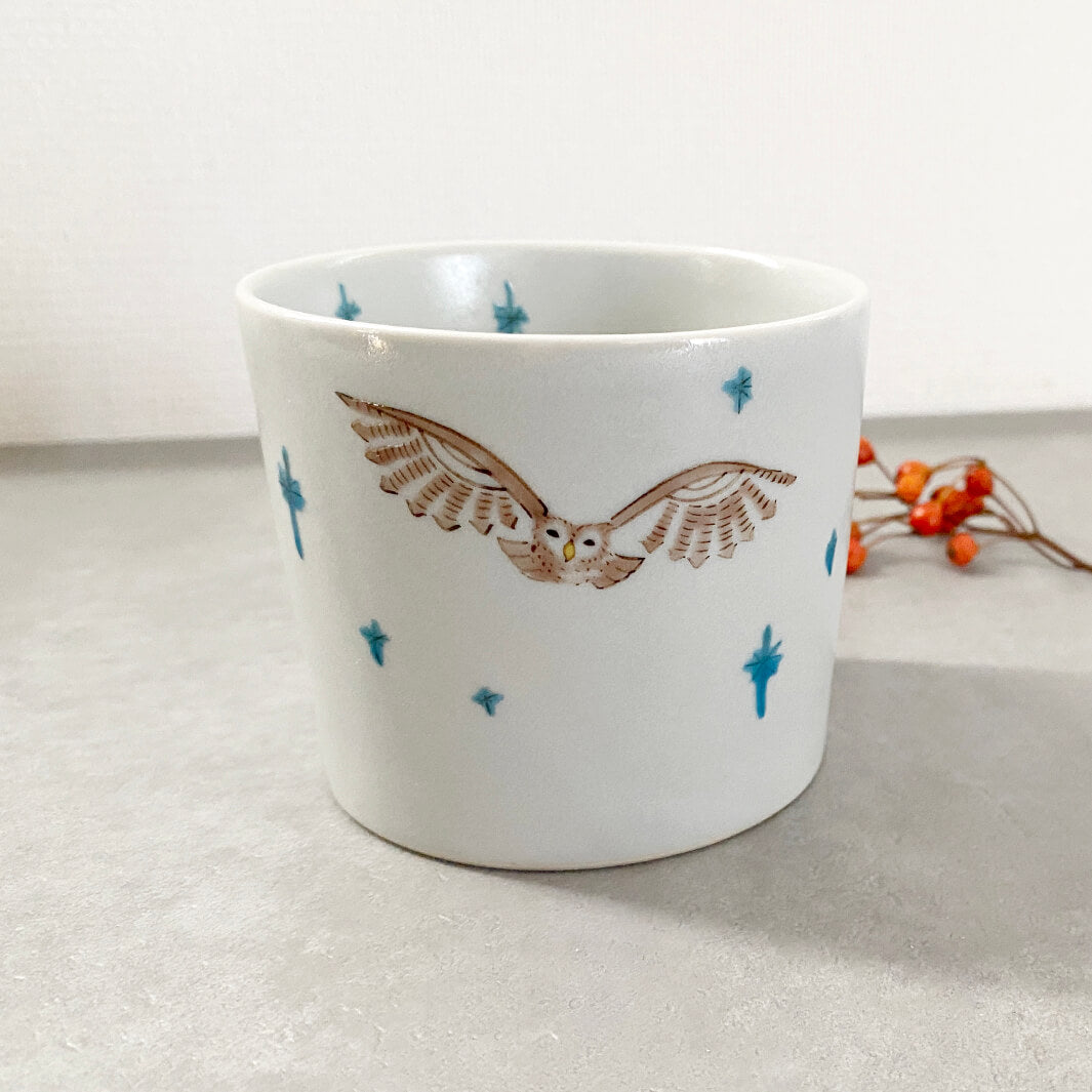 鳥の中でもフクロウが好きで、器にフクロウを描きたいと思いまずモチーフとして選びました。そして器を作っている時間が主に夜なのと、フクロウとも相性が良いことから月もモチーフとして選びました。