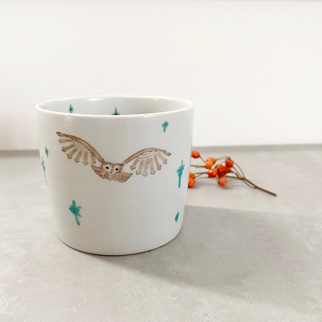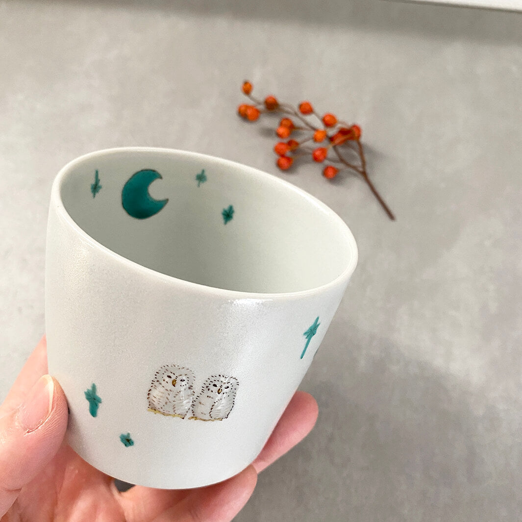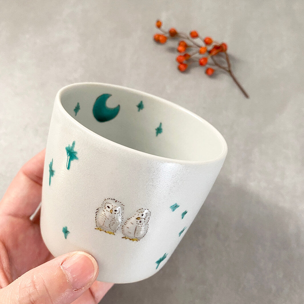 「フクロウ」と「月」を主のモチーフとして、可愛らしさの中にどこか神秘的な空気を纏った器たちを生み出しています。日常使いしやすいベーシックな形状に加え、色の組み合わせや展開にも細やかな工夫が込められています。