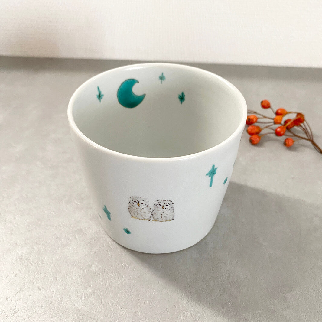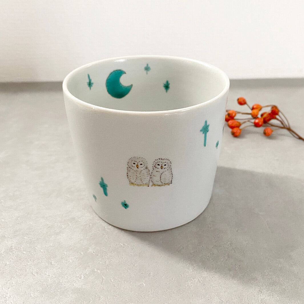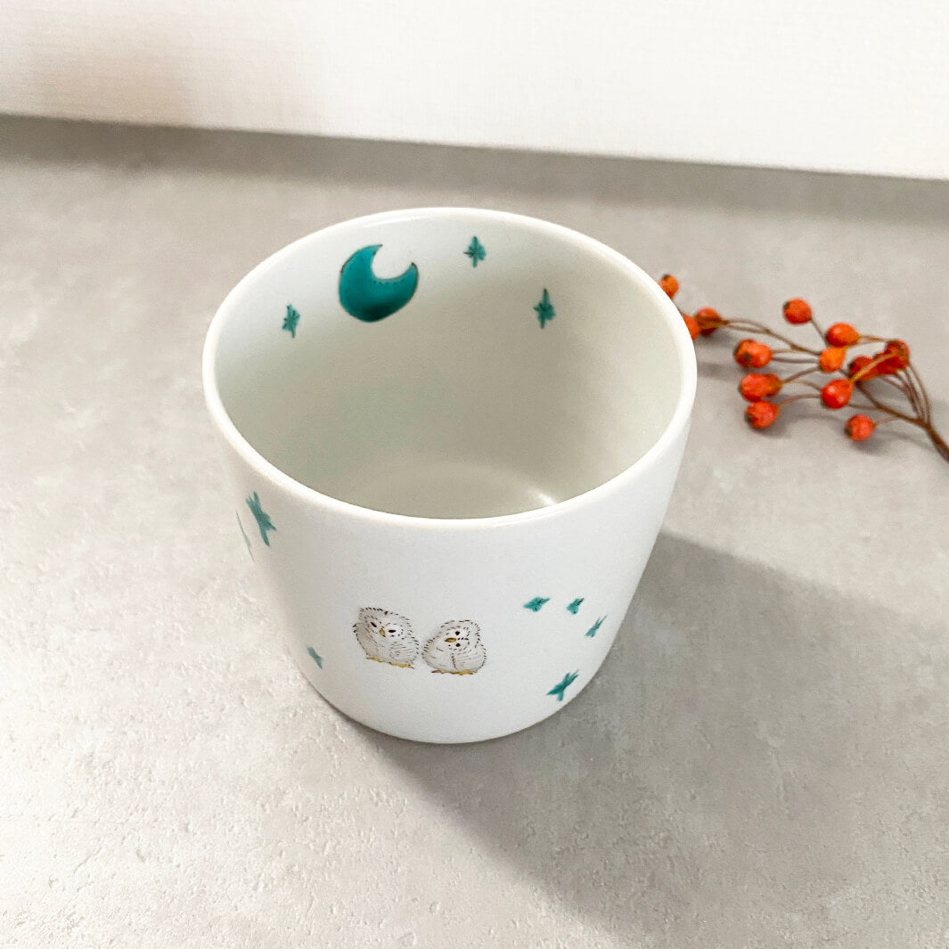 鳥の中でもフクロウが好きで、器にフクロウを描きたいと思いまずモチーフとして選びました。そして器を作っている時間が主に夜なのと、フクロウとも相性が良いことから月もモチーフとして選びました。